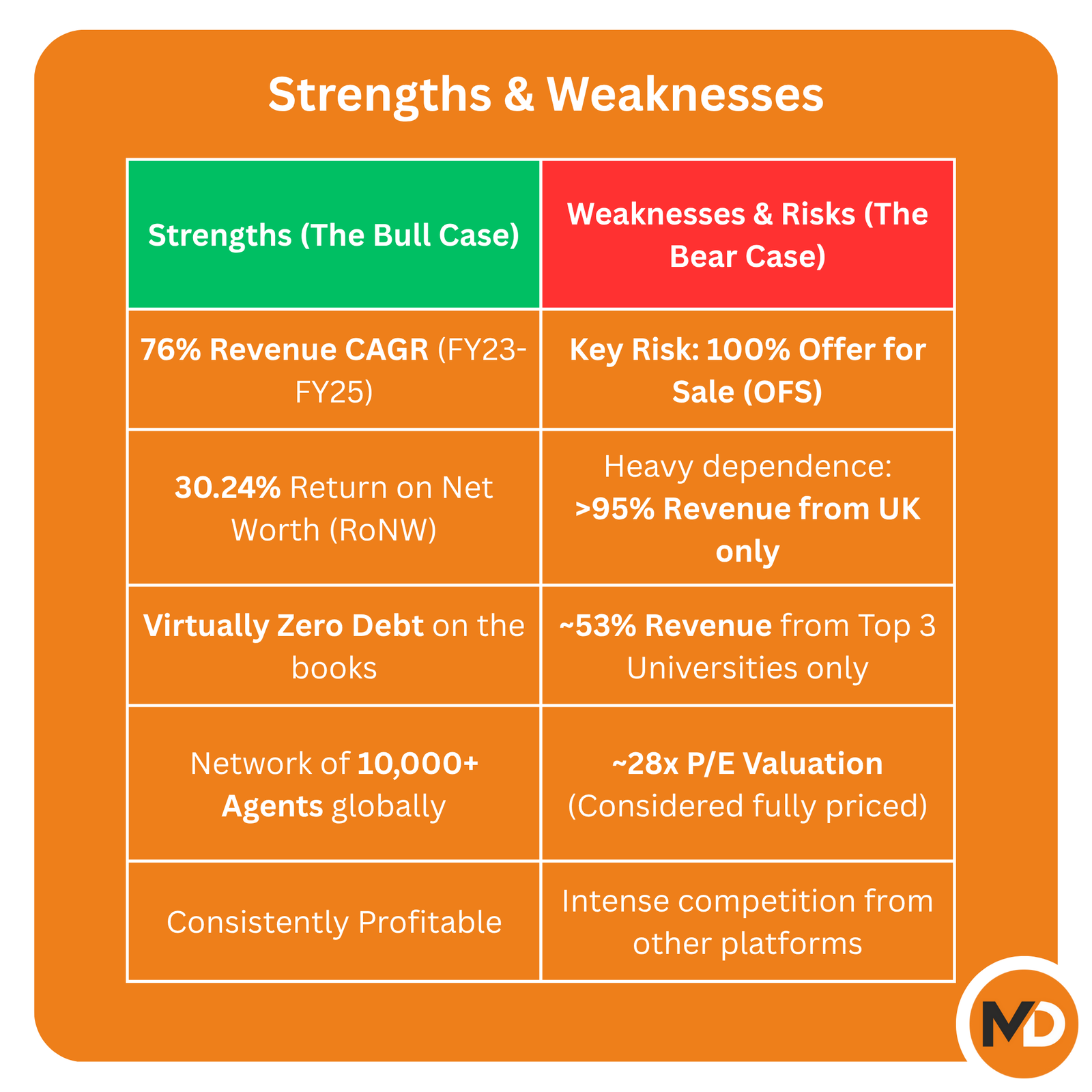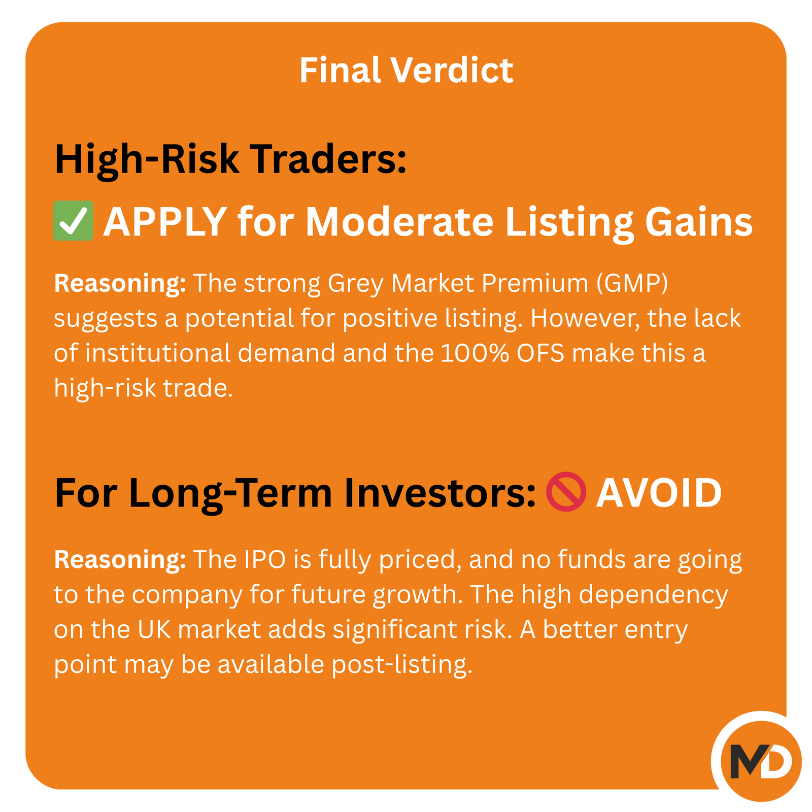 However, this is countered by a fully priced valuation, a 100% Offer for Sale structure, heavy dependence on the UK market, and a lukewarm response from institutional investors on Day 1.