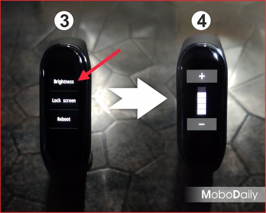 Mi band 4 facilitates brightness control up to 5 levels which can be adjusted manually in the band settings without the help of Mi fit app.